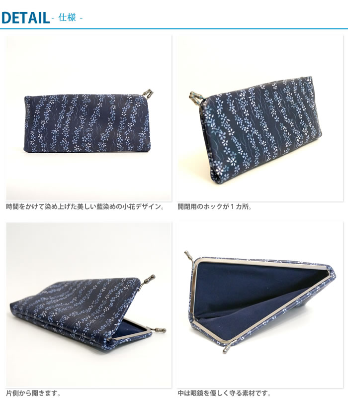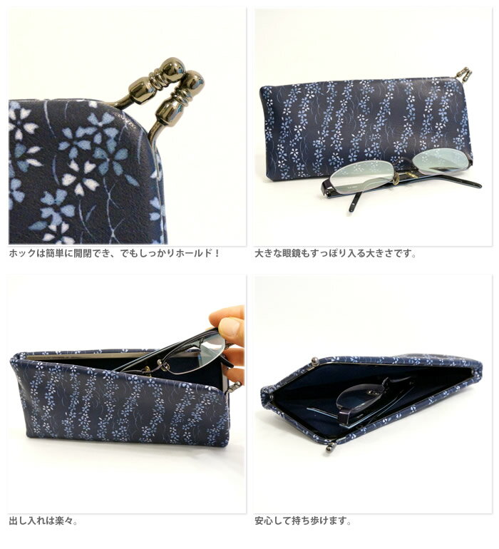 項目 内容 タイトル 日本製 本革 藍染め レディース がま口 メガネケース 口金 リーディンググラスケース 天然染め 花柄 おしゃれ 小花 ペンケース 老眼鏡 和風 和柄 国産 母の日 敬老の日 プレゼント サイズ W18.5cm×H8.5cm×D1.5cm 重さ 約74g 素材 外側/天然皮革(牛革)内側/フランネル カラー 藍 仕様 メイン収納×1藍染め2段ポケット親子がま口財布 藍染め親子がま口財布 藍染めリーディンググラスケース 藍染めお財布ポーチ