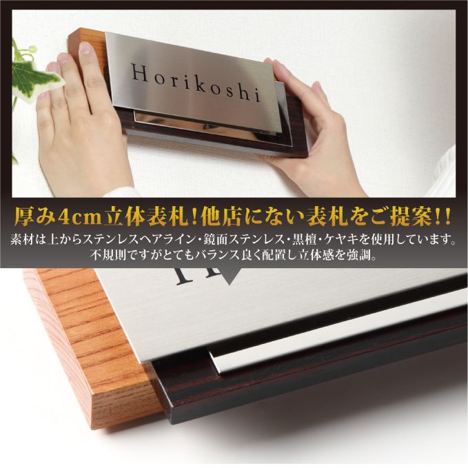 ■■■■■■■■■■■■■■■■■■■■■■■■■■■■ 【表札寸法】・24x10cm 厚み4cm 【使用素材】・ステンレス2種・ケヤキ材・縞黒檀 【文字加工】 ・塗装仕上げ ※文字加工はコチラ 【取付け方法】 ・簡易ユニット・接着剤固定 ※取付方法はコチラ 【付属品】 ・取付け説明書 ・接着剤 ・取付けボルト 【規格外寸法】 ・不可 【納期】 ・ご注文確定後10〜14日営業日以内の発送 【発送方法】 ・ゆうパック 【支払方法】 ・クレジットカード・銀行振込・代金引換 ※表札に入れるお名前は買い物かごに入れたあと 備考欄に記載してください。