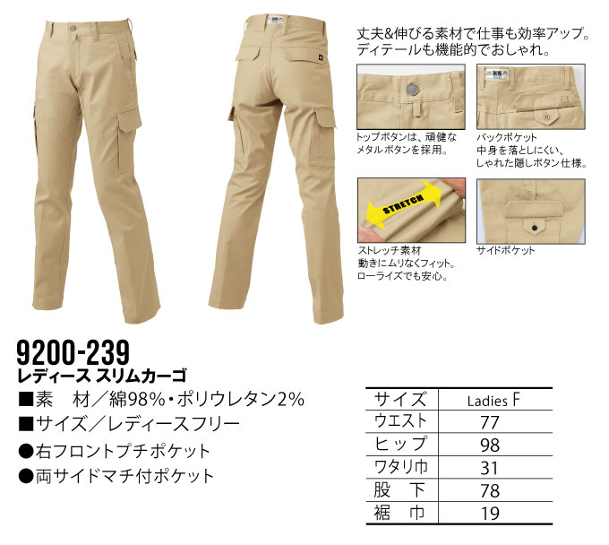 寅壱 トライチ レディーススリムカーゴパンツ フリーサイズ サイズフリー 吸汗性 美脚 作業服 作業着 9200シリーズ 9200-239